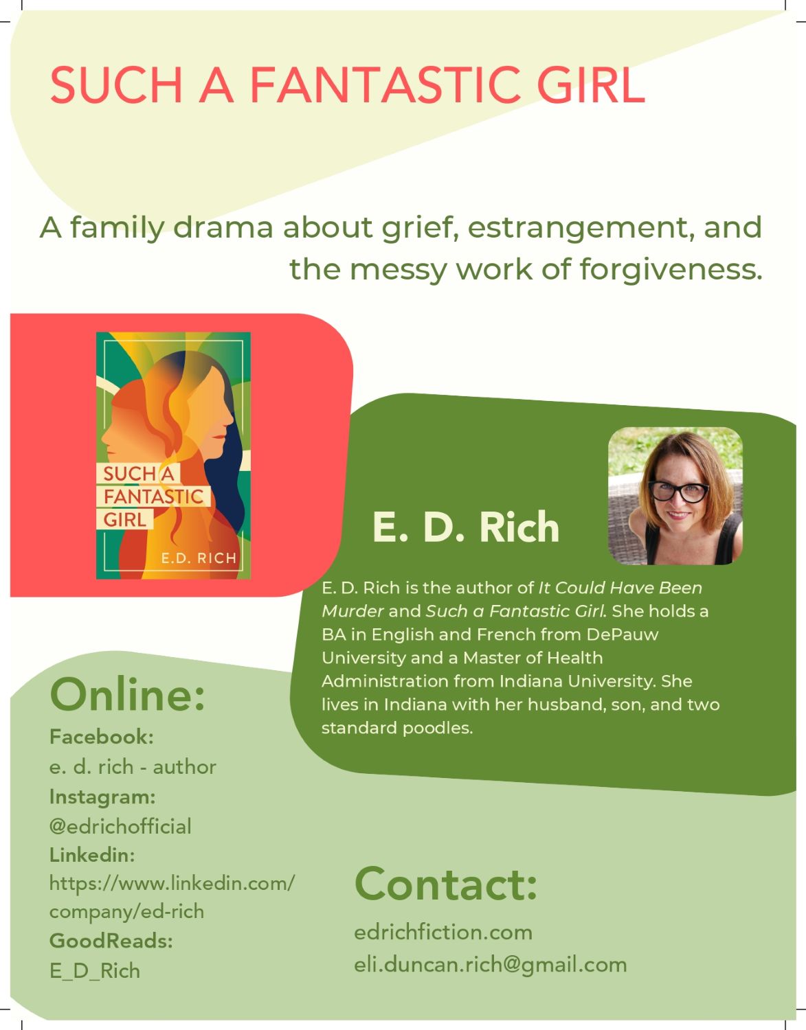 E.D. Rich earned a BA in English and French from DePauw University, followed by an MHA (Master’s in Health Administration) from Indiana University. An Indiana native, E.D. Rich is married, has one son and two dogs. Her newest release, “Such a Fantastic Girl, was published in September 2025. Her debut novel, “It Could Have Been Murder,” was published in November 2024. Ms. Rich is hard at work on several other exciting writing  projects. Ms. Rich is an avid knitter, and if you meet her in person, she will probably offer to knit you a hat.